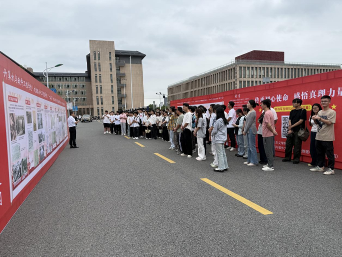 为深化党史学习教育,推动爱国主义精神在青年学子中落地生根,9月18日,马克思主义学院党支部联合计算机与软件工程学院(大数据与人工智能学院)党总支,共同开展“一站式”学生社区红色文化展播系列活动。活动以“重温抗战历史,传承红色基因”为主题,聚焦新四军在皖抗战史(侵华篇),为师生带来一场兼具历史厚度与思想深度的现场思政课。活动现场,马克思主义学院张贤法老师以芜湖本土抗战历史为切入点,在展板前向同学们生动讲述:“芜湖是一片有着光荣革命传统的红色热土,抗战时期,中国共产党领导的新四军团结芜湖人民,在极端困苦中创建皖江抗日根据地核心区,谱写了不屈不挠的斗争壮歌。”他通过回顾新四军在皖南地区的艰苦卓绝历程,深刻阐释“落后就要挨打”的沉痛教训,让在场师生真切感受到中国人民在民族危亡时刻展现的坚韧意志与家国情怀。(图为活动现场)此次活动延续“现场宣讲+展板呈现+学生讨论”的立体化形式,展板系统呈现了日本侵华背景、新四军在皖抗战关键事件及芜湖本土革命遗址等内容,让抽象的历史变得可感可知。计科2303班陈家