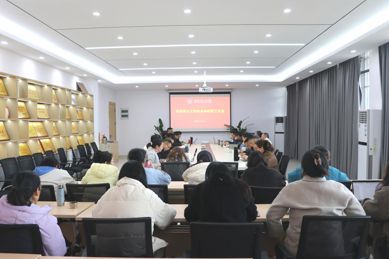 本网讯 为全面部署新学期各项工作,确保新学期学院教学、科研及管理等工作平稳有序、高效推进,3月11日下午,马克思主义学院在A1N502会议室召开2025—2026学年春季学期期初全体教职工大会。会议由马克思主义学院常务副院长胡安全主持,全体教职工参加会议。(图为会议现场)会议伊始,院长助理任晨晨对学校下发的《安徽信息工程学院教职工考勤管理办法(2025年修订版)》《安徽信息工程学院教职工请销假管理办法》《安徽信息工程学院教职工考勤违规处理办法》《安徽信息工程学院交通安全管理办法》《安徽信息工程学院交通管理优化方案》等政策文件进行了详细宣贯,并就新学期听课要求及反馈机制、教学质量评价等教学运行环节作出强调,确保各项教学管理规定落到实处。(图为任晨晨进行文件宣贯)随后,胡安全就学院师资队伍建设情况进行了全面通报。他指出,当前学院师资年龄结构持续优化,职称结构渐趋合理,但学历结构仍有待进一步优化提升。他强调,高水平师资队伍是学院发展的核心支撑,未来要继续加大高层次人才引入力度,不断提升教师队伍