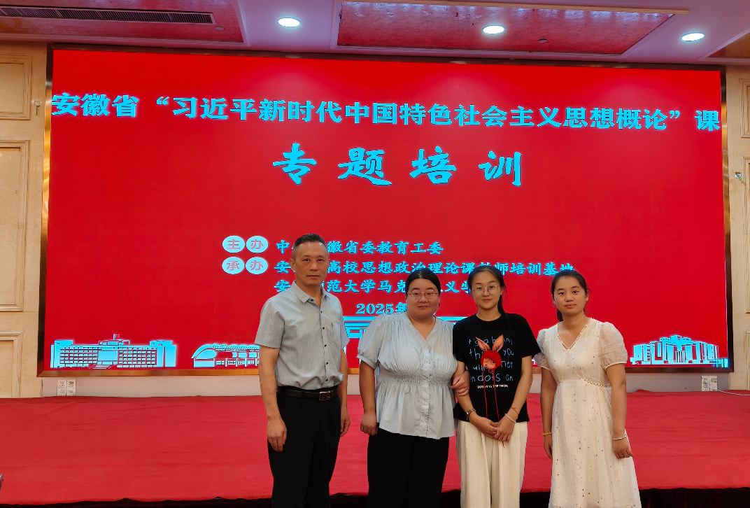 为深入学习贯彻习近平新时代中国特色社会主义思想,切实加强思政教师队伍建设,全面提升思政教育质量,着力增强思政课教师的核心素养,8月16日至20日,我校马克思主义学院选派刘洪、李婵、骆月明、李林、杜琪琪五名教师参加了安徽省2025年高校思想政治理论课教师岗前培训。此次培训由中共安徽省委教育工委主办、安徽省高校思想政治理论课教师培训基地(安徽师范大学)、安徽师范大学马克思主义学院承办,来自全省多所高校的思政课教师齐聚一堂,共同进行思政教育的学习与交流。(图为我校马克思主义学院教师参加安徽省2025年高校思想政治理论课教师岗前培训)在主题报告阶段,来自南开大学、华中师范大学、河海大学、安徽师范大学等高校的专家为学员授课,安徽师范大学马克思主义学院院长姚宏志、李祥兴副院长做主持。安徽师范大学马克思主义学院王先俊教授作了《学习领会总书记关于思政课建设的重要论述,讲好建好新时代高校思政课》的辅导报告、华中师范大学马克思主义学院教授高鑫作了《思政课教学的基本方法》的辅导报告、安徽师范大学教授张正光作了